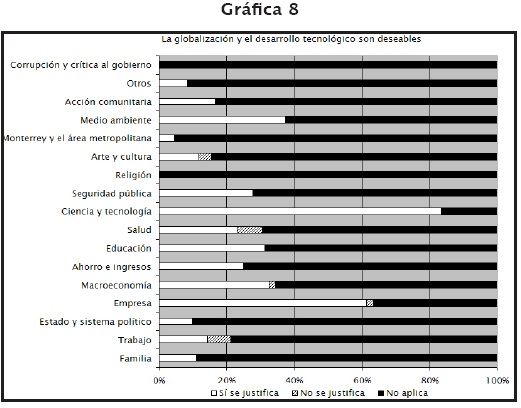Como se ha observado a lo largo de la investigación, la crisis de la década de 1980 operó como un parteaguas de las posibilidades de crecimiento de las empresas locales en términos de su expansión geográfica. Las mismas se reestructuraron de manera que pasaron de un modelo productivo, destinado al mercado nacional, a otro de tipo global en el cual, para ser competitivas, revaloraron la tecnología y el capital extranjero. En este contexto, se considera interesante medir la importancia que el periódico otorga en su cobertura a cuestiones vinculadas con la globalización y el desarrollo tecnológico (véase gráfica 8). Los resultados fueron los esperados, en la medida en que hay una visión positiva de la globalización así como hay también muestras de orgullo sobre los logros y conquistas de las empresas locales en mercados internacionales. En numerosas ocasiones, el periódico El Norte cubre las acciones de empresas regiomontanas llevadas a cabo en el exterior.