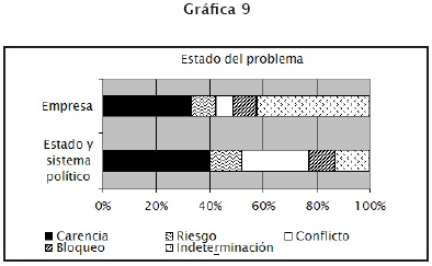 Todos los datos analizados llevan a reflexionar sobre las diferencias que existen en la cobertura del periódico al presentar información sobre el Estado y las empresas. Para dar luz sobre estas divergencias, se decidió analizar la postura del periódico a través de categorías de problemas.23 La intención es mostrar "cómo" se habla del Estado y de las empresas, independientemente del tema al que se refiera la nota. Mc Combs, autor que se ha dedicado a realizar estudios acerca de la agenda de los medios de comunicación, describe la "situación problemática" como un concepto que va más allá de la categorización de las noticias por temas y se introduce en el ámbito de la percepción (Edelstein, 1993: 93-94). De esta manera, el trabajo no se enfoca exclusivamente en el análisis de temas sino que pretende llegar, a través de la exposición de los problemas, al estudio de la construcción de imágenes y perspectivas; siendo éste último el nivel donde se da la influencia de los medios en la construcción de representaciones sociales por parte de la sociedad (véase gráfica 9).