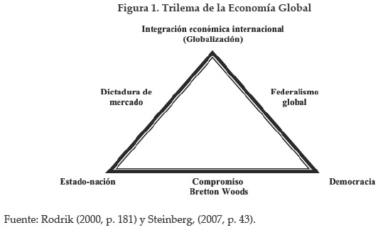 El trilema de la economía global sostiene que, si se opta por la integración económica internacional (globalización), no es posible mantener simultáneamente la democracia y el Estado nación, hay que escoger uno de los dos. Si se elige la democracia y la globalización (en la figura 1 representado como federalismo global) las organizaciones supranacionales democráticas tendrán el poder de dictar leyes, teniendo que acatar las normas de dichos organismos. Se trataría de un modelo de gobernanza global instrumentado mediante organismos supranacionales5. Este sistema se ha intentado implementar en la Unión Europea (UE) en donde persiste la esencia democrática en los estados miembros, ya que éstos representan los intereses de sus ciudadanos ante las instituciones de la UE. No obstante, este sistema presenta deficiencias, principalmente en el ámbito de la integración política. Muestra de ello fue el rechazo de algunos países miembros a la instauración de una Constitución Europea. Además, si se toma en cuenta que la distribución de poder en el sistema internacional es claramente desigual y favorece a los países desarrollados, existe un serio riesgo de que el federalismo global se convierta de facto en una dictadura global. Si los grupos económicos más favorecidos utilizaran los organismos supranacionales para realizar sus agendas a través de sus representantes nacionales, se fomentaría una dictadura tanto económica como política en el mundo.