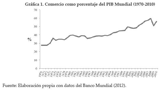 Después de ocho rondas multilaterales de negociación comercial -siendo la primera en Ginebra en 1947 con la participación de 23 países, y la última ronda en Uruguay (1986-1994), con 123 miembros participantes-las barreras a las importaciones de bienes manufacturados en los países miembros se redujeron considerablemente permitiendo un rápido crecimiento del comercio internacional. Éste ha presentado un incremento constante desde mediados de los años setenta hasta llegar a representar el 55% del PIB mundial en 2010 (gráfica 1).