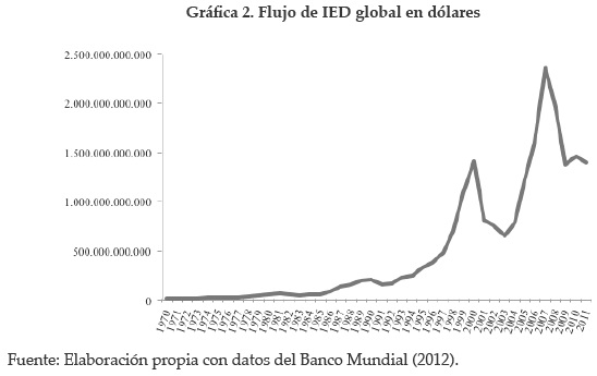 Como consecuencia a esta desregulación de las normas nacionales19, los flujos de IED global habían aumentado de forma regular hasta el año 2000, cuando se registró un crecimiento abrupto presentando un máximo histórico en 2007 de $2.355 mil millones de dólares (Banco Mundial, 2012) (Gráfica 2).
