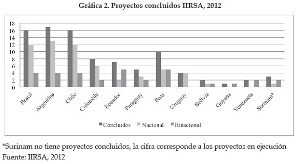 La gráfica 2 muestra el número de proyectos concluidos en los países participantes, así como el ámbito de los mismos (nacionales o binacionales). Hasta el 2011, Brasil había concluido 16 proyectos del IIRSA, 12 de ellos (75 %) eran nacionales con un costo de poco más de 4.3 mil millones de dólares (mdd) y sólo 4 (25 %) fueron binacionales, con un costo de 22 mdd. Brasil, Argentina y Chile son los tres países con mayor cantidad de proyectos IIRSA concluidos: 16, 17 y 16, respectivamente. Sin embargo, por el rubro de cantidad de dinero invertido únicamente en proyectos nacionales, Brasil es el país que ha realizado una mayor inversión.