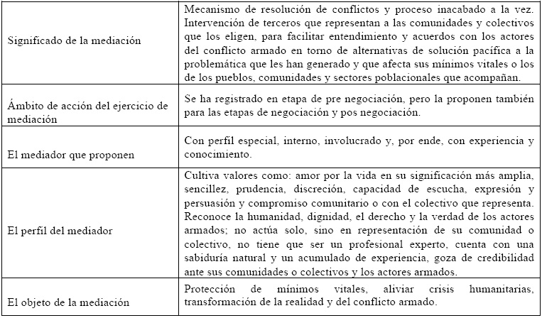 Coinciden al reconocerse como "terceras partes"16 frente al conflicto armado, identificar sus intervenciones en el mismo como ejercicio de mediación, asumirla como un proceso y, al mismo tiempo, como un mecanismo de resolución de conflictos y proponer un enfoque de mediación propio, diferente del contemplado en los presupuestos teóricos más clásicos o tradicionales sobre la misma (Ibíd., pp.506 - 513). En igual forma, al establecer que quienes median deben tener un perfil especial y que ejercen dicha labor en representación de las comunidades o colectivos que los eligieron para tal fin. También, al adoptar un procedimiento para mediar y reconocer que sus prácticas de mediación han logrado alcances concretos y palpables (Ibíd., p. 506, 309).