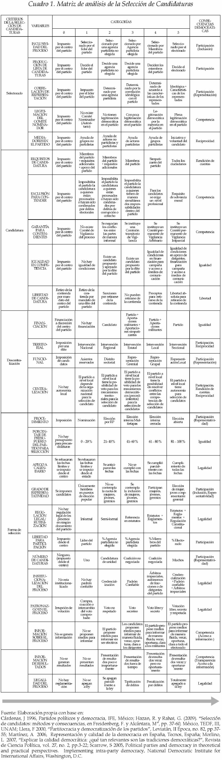 This article aims to systematize the process of candidate selection under the assumption that is possible to evaluate their democratic consecuenses in the political party and evaluate their evolution. The proposal was made from an analytical model of wich qualitative and quantitative formulation is based on a matrix that sets a primary index with classification criterias, comments and categories of the processes. The organization of information in the matrix analyzes the selection of candidates as the dependent variable from the determinants of selectorate, nomination, descentralizarion and selection form as independent variables. Standardizing of the information allows made comparisons between processes, between parties and between criteria.