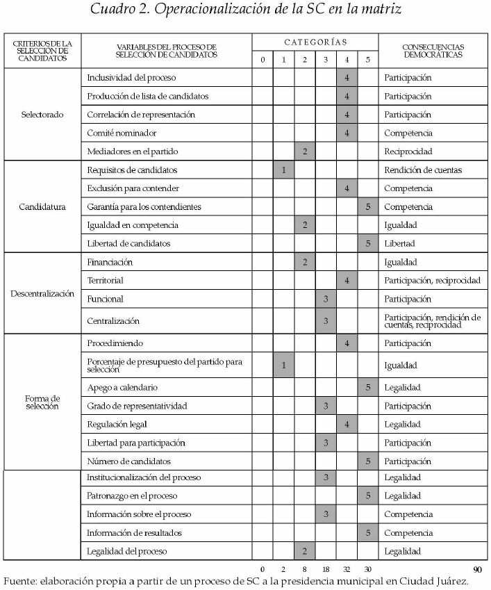 La conversión de los datos de la matriz en valores numéricos se realiza después de conocer y definir las condiciones de cada proceso, en cuanto a las variables y criterios para cada una de las categorías de la SC. Dentro de cada categoría y sus variables, los criterios tienen un valor numérico que va de menor a mayor de acuerdo a su acercamiento a las mejores consecuencias democráticas que implica, es decir, a mayor calificación mejores condiciones democráticas.