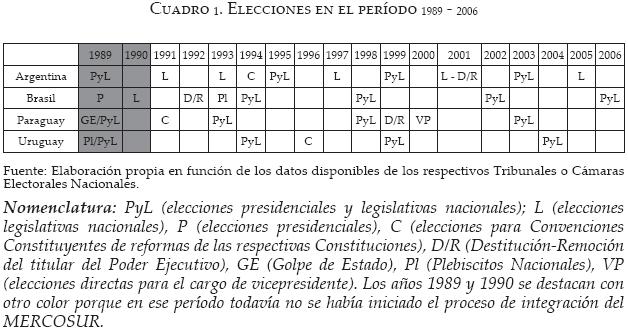 Si en términos de composición consideramos, además, los tiempos electorales, observamos que el problema se agudiza. En el cuadro 1 se resumen las diferentes elecciones a nivel nacional que involucraron a los Estados del MERCOSUR en el período bajo análisis: