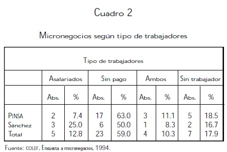 En consecuencia, siendo básicamente una actividad encaminada a la subsistencia de la familia, es usual que los micronegocios constituyan entidades económicas unipersonales o que las relaciones con otros trabajadores estén basadas en formas de empleo no asalariadas. De hecho, la encuesta permitió determinar que el tamaño promedio de los micronegocios en ambos parques industriales es inferior a los dos trabajadores por unidad y, en forma más detallada, que el 17.9 por ciento de los negocios son atendidos sólo por sus propietarios, el 46.1 por ciento por dos personas, el 23.1 por ciento por tres y el restante 12.9 por ciento por cuatro. Por lo que respecta al vínculo de los trabajadores de apoyo con el negocio, la encuesta mostró que la relación dominante en los negocios de ambos parques industriales es el trabajo no asalariado. En el parque PINSA, por ejemplo, casi cuatro de cada cinco negocios con empleados se basaban en trabajadores sin pago (cuadro 2).