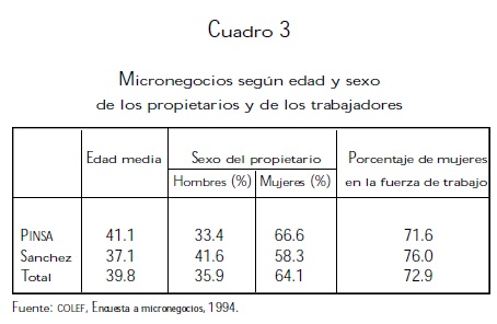 Algunos estudios han indicado que la participación de las mujeres en actividades informales es sustancial mente más alta que la de los hombres, debido a que éstas enfrentan mayores dificultades para asegurar un empleo en el sector formal ya que las condiciones de trabajo en la industria y el comercio moderno son incompatibles con el papel reproductivo de las mujeres (Tiano: 1986). También se ha observado que existe una conexión entre las actividades desarrolladas por las mujeres en el ámbito doméstico y las actividades realizadas en el ámbito laboral (De Barbieri, 1991:207). En forma consistente con ambos planteamientos, los resultados de la encuesta indican que las mujeres constituyen casi dos tercios de los propietarios de los negocios de venta de comida en los dos parques industriales de Nogales (cuadro 3). La participación de las mujeres es también muy alta en la fuerza de trabajo, ya que más del 70 por ciento de los trabajadores en los micronegocios son del sexo femenino.