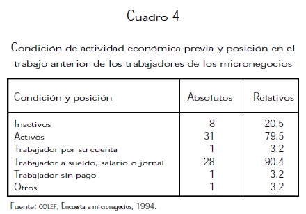 Como hemos visto, la participación previa en el mercado de trabajo es una característica dominante entre los propietarios de los micronegocios. Esta situación, junto con el hecho de que hayan sido marginados de las actividades formales por la insuficiencia de los salarios o por el cierre de fuentes de trabajo, muestra que el empleo en las actividades informales es una opción obligada por el imperativo de tener una fuente de ingreso y la necesidad de garantizar la reproducción individual y grupal.