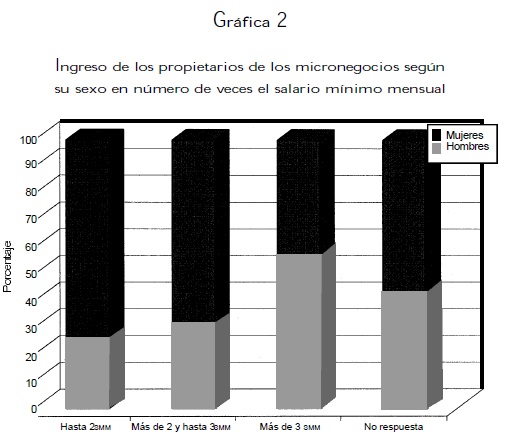 Al analizar los ingresos obtenidos por los negocios jefaturados por mujeres y por hombres, las diferencias también resultan notables. Por ejemplo, en el rango de ingresos más bajo, correspondiente a ingresos inferiores o iguales a dos salarios mínimos, la concentración de negocios jefaturados por mujeres fue del 73 por ciento (gráfica 2). En el otro extremo, el 57 por ciento de los micronegocios en el rango de 3 o más salarios mínimos fue jefaturado por propietarios hombres. Estos datos estarían reforzando las conclusiones de estudios previos en el sentido de que los negocios conducidos por mujeres en el sector informal son menos rentables que los conducidos por hombres. No obstante, estos mismos datos parecen estar en contradicción con el supuesto de que la mayoría de las mujeres involucradas en actividades informales invierten menos tiempo que los hombres y que como consecuencia de ello también obtienen menores ingresos (Tinker, T 987: 54). Parece plausible suponer que las disparidades en la rentabilidad está asociada directamente con las condiciones de entrada a la actividad e indirectamente con el monto y el control que ejercen los individuos sobre los recursos disponibles en el hogar, y no con el tiempo de trabajo dedicado al negocio.