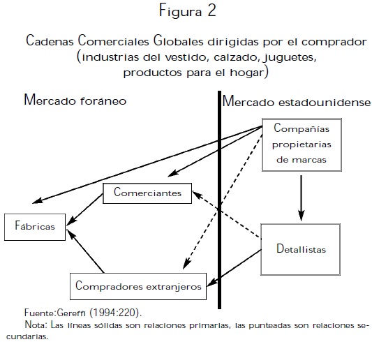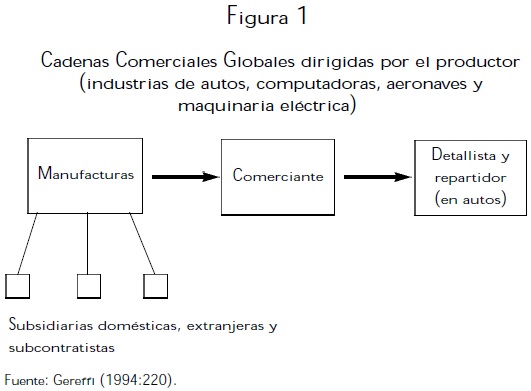 1) Estructura de entrada-salida (input-output). 2) Territorialidad, es decir, dispersión espacial o concentración de la producción y las redes mercantiles compuestas por empresas de diferentes tipos y tamaños. 3) El control de la estructura, esto es, las relaciones de poder y autoridad que determinan cómo se localizan y fluyen los recursos financieros, las materias primas y los recursos humanos; al respecto, Gereffi (1994), distingue dos formas: el control ejercido por el productor (producer-driven), y el control orientado por el comprador (buyer-driven) (ver figuras 1 y 2).