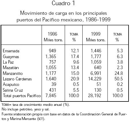 El análisis previo revela que la mayoría de los puertos del litoral han manifestado inestabilidad, breves periodos de crecimiento combinados con largos ciclos recesivos, salvo Manzanillo y Lázaro Cárdenas, que mantienen un crecimiento sostenido desde la apertura comercial hasta la fecha (1999). Tal dinámica generó la pérdida del relativo equilibrio de los flujos y puertos del Pacífico, lo que dio lugar a un acelerado proceso de concentración. Todavía en 1986 había una distribución de los flujos entre los seis puertos más importantes del litoral; sin embargo, en 1999, Manzanillo y Lázaro Cárdenas concentraron más del 75% de los flujos de mercancías no petroleras. Por lo tanto, la participación relativa de puertos como Guaymas, Ensenada, La Paz, Mazatlán y Salina Cruz cayó considerablemente (cuadro 1).