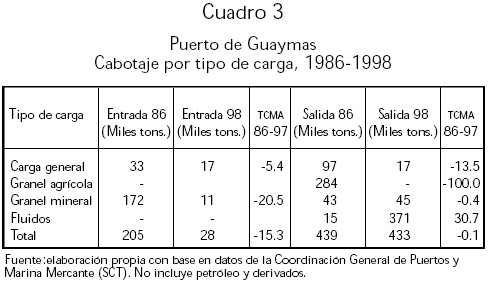 A diferencia del crecimiento mostrado por los flujos de comercio exterior, los movimientos de cabotaje presentan una notable contracción entre 1986 y 1998 (cuadro 3). El elevado volumen de granos y carga general que los productores del estado de Sonora enviaban por vía marítima a distintas regiones del país ha dejado de circular por Guaymas: tales flujos han sido sustituidos por bienes importados de menor costo, producidos en Norteamérica y otros continentes. El único flujo de cabotaje que tiene significación es el ácido sulfúrico que se envía desde la terminal de fluidos de Guaymas hacia las industrias del puerto de Lázaro Cárdenas.