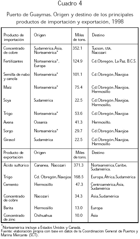 En definitiva, cuando se analiza el origen y destino de los principales productos de comercio exterior manejados por Guaymas, destaca la ausencia de bienes manufacturados de mayor valor agregado, generados tanto en la zona como en estados vecinos. En 1998, los principales productos de importación movilizados a través del puerto se ubican en el ámbito de actividades primarias del estado de Sonora. Tales flujos correspondieron a graneles minerales y agrícolas utilizados como insumos para procesos productivos regionales.