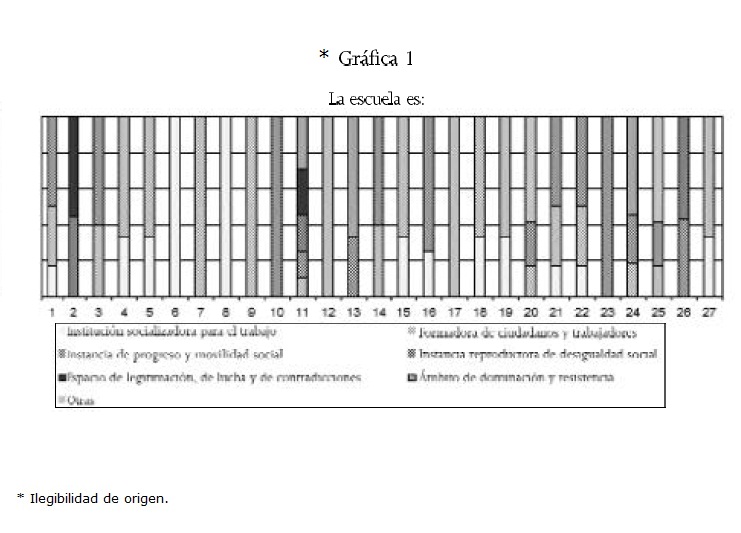 Acerca de la escuela como institución, la respuesta más frecuente (35%) fue la que consideró ésta como una "institución formadora de ciudadanos y trabajadores". En segundo lugar, se ubicó la opción de "instancia de progreso y movilidad social", con un 25%. En tercer sitio, quienes opinan que la escuela es "una institución de socialización para el trabajo", con 22%. Las respuestas inspiradas desde una perspectiva crítica, como aquellas que explícitamente mencionaban que la escuela es "una instancia donde se reproduce la desigualdad social" o se trata de "un espacio de dominación y resistencia" tuvieron 5% cada una.