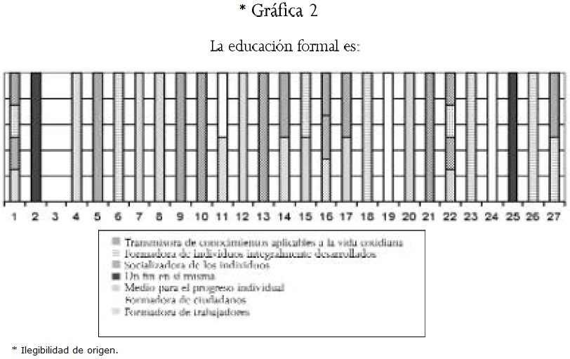 La frecuencia más alta fue la opción que consideraba a la educación formal como "transmisora de conocimientos aplicables a la vida cotidiana", con un 28%. En segundo y tercer sitio estuvieron las opciones que la describen como "una formadora de individuos integralmente desarrollados" y como "formadora de trabajadores que afronten los retos del presente y del futuro", con un 20% y 18%, respectivamente. Cercana a las anteriores quedó la opción referida como "un medio para el progreso individual" con un 13%. Luego quedaron las respuestas que la describían como "formadora de ciudadanos mexicanos" y como "socializadora de los individuos en las sociedades modernas", con 7% cada una. Un 2% no contestó.