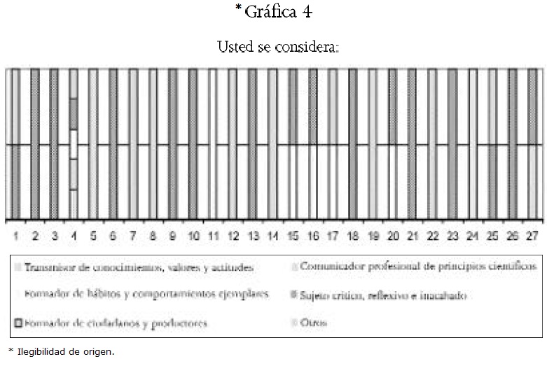 Los datos sobre lo que cada encuestado considera sobre sí mismo indican lo siguiente: un 44% opina ser "un sujeto crítico, reflexivo e inacabado en busca de transformar su quehacer". Un 16% optó por expresar que es "un formador de hábitos de disciplina, responsabilidad y comportamientos ejemplares" y un 13% por señalar la opción de "otros". Esto significa que hubo quienes no se identificaron en absoluto con nuestras posibilidades, o por la forma en que fueron redactadas; por ello anotaron su propia definición. En tal caso, algunas de las respuestas fueron: "normal y ordenada, y me gusta tener mis cosas a tiempo"; "amiga de mis alumnos"; "como parte de una conexión entre entes pensantes y una realidad evolutiva"; "un maestro normal". Con un 11% quedó la opción "un formador de ciudadanos y productores". Con un menor porcentaje estuvieron las opciones marcadas por quienes se consideran como un "excelente transmisor de conocimientos, valores y actitudes" (8%), o como un "comunicador profesional de principios científicos y conceptos objetivos" (8%).