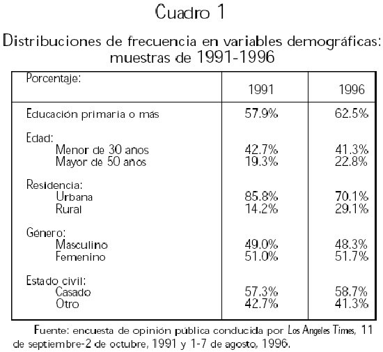 Como se observa en el cuadro 1, la distribución de frecuencias sobre una lista de variables demográficas (educación, edad, localidades urbanas/rurales, género y estado civil) indica que la composición de ambas muestras es similar. La única excepción es la base urbana más acentuada en la muestra de 1991; sin embargo, las muestras no difieren significativamente en otras características. Por lo tanto, confiamos y enfatizamos que las características socioeconómicas de las dos muestras son generalmente comparables.