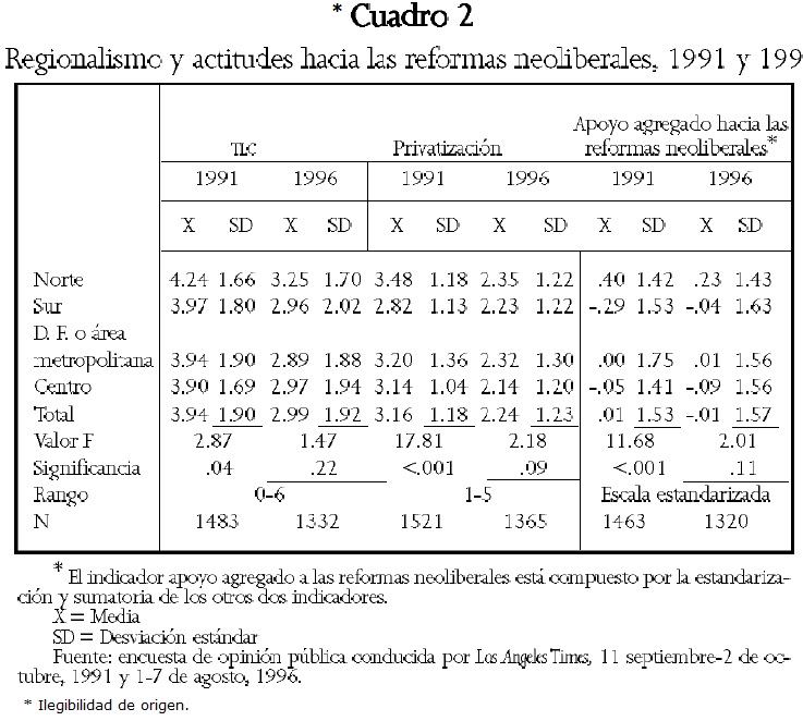 No hay suficiente info rmación para conocer las tendencias a largo plazo de la opinión pública mexicana. Sin embargo, hemos examinado la naturaleza de las disparidades regionales de ap oyo ciudadano al neoliberalismo en 1991 y 1996, utilizando encuestas de opinión a nivel nacional. Los resultados proveen información valiosa para formar un amplio consenso transregional a favor del neoliberalismo y la globalización en México.