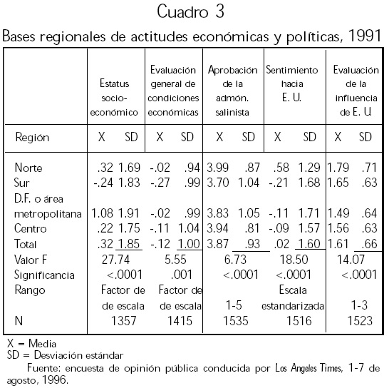 Una revisión cuidadosa de los resultados en el cuadro 2 muestra que el norte se coloca primero, seguido del D. F. , la región central y por último el sur (1991). Para 1996, la región central ocupa el cuarto lugar, mientras que el sur pasa de último a tercero. Existe entonces un patrón constante del norte a colocarse más alto en la escala que las otras regiones, en tanto que el D.F. ocupa la segunda posición seguida por las otras dos regiones. El siguiente paso es determinar si los ciudadanos en el norte y el D.F. también se colocan arriba de las dos regiones restantes en estatus socioeconómico, en evaluaciones económicas y desempeño gubernamental. Si éste es el caso, entonces nuestros resultados concuerdan con la posición utilitarista. Igualmente, si las regiones norte y D. F. permanecen por encima del centro y sur en actitud favorable hacia los Estados Unidos, entonces la explicación cultural se confirma. Es importante subrayar que las inferencias causales a este nivel de análisis deben considerarse tentativas debido al problema provocado por el uso de sólo cuatro regiones (small N problem) en el análisis.14
