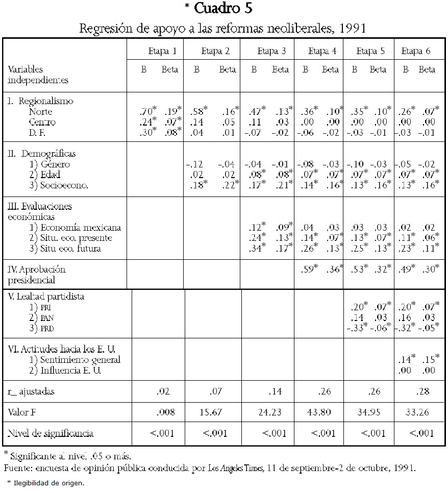 Por tanto, las evaluaciones personales de la situación económica futura, estado socioeconómico, aprobación presidencial y sentimiento hacia los Estados Unidos son factores más significativos de apoyo a reformas neoliberales que cada región en particular (etapa 6 del cuadro 5). La región en la cual habita cada individuo tiene relativamente poca influencia en la variable "apoyo a las reformas neoliberales" una vez que los efectos de las demás variables son controlados, con la excepción del norte, que sí muestra independencia estadística en apoyo al neoliberalismo.