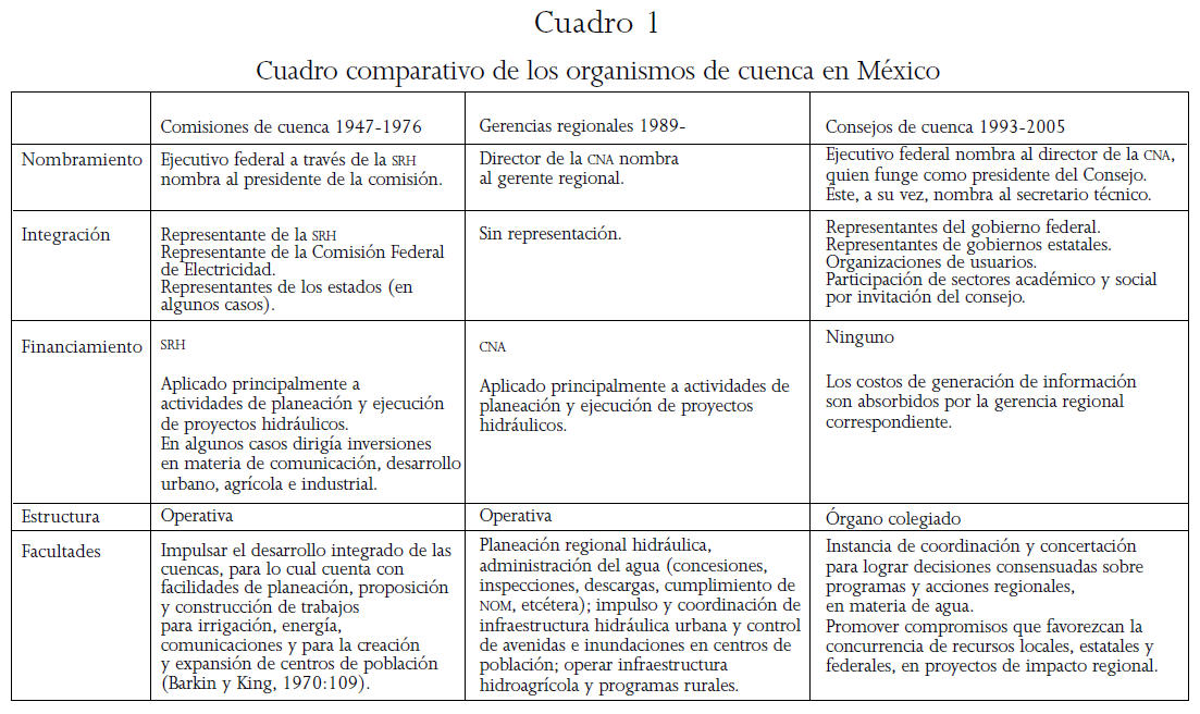 Difícilmente podría afirmarse que las comisiones de cuenca que existieron entre 1947 y 1976 sean un antecedente directo de la figura de los actuales consejos de cuenca, pues no existen coincidencias sustantivas en términos de integración, estructura, financiamiento y funciones (véase cuadro 1). En todo caso, la referencia más directa de las comisiones de cuenca serían las gerencias regionales actuales, que dependen directamente de la CNA aunque, a diferencia de aquéllas, carecen de autonomía presupuestal y jurídica.7