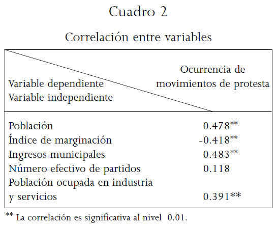 Para identificar las condiciones socioeconómicas de los municipios en donde se registraron movimientos, se analizó la correlación resultante entre la ocurrencia de movimientos de protesta como variable independiente y la población, viviendas con servicios y población económicamente activa (PEA), ocupada en sectores primario y secundario como otras variables. Esta coincidencia espacial se corroboró al resultar significativa la correlación inversa entre la ocurrencia de movimientos de protesta y el índice de marginación. Asimismo, la correlación con las variables de población, viviendas con servicios y población ocupada en los sectores secundario y terciario resultó positiva. Lo anterior indica que los municipios con menores condiciones de marginación presentan un registro mayor de movilizaciones sociales.