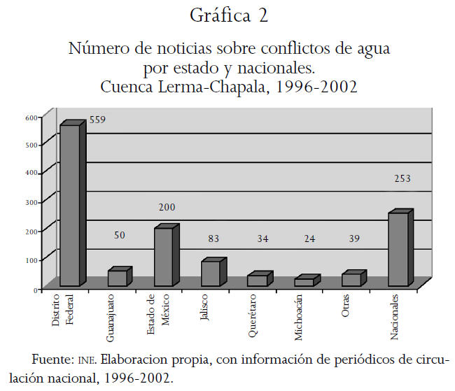 En la gráfica siguiente, se analiza la cantidad de noticias por estado. Destaca la atención otorgada por la opinión pública a los temas del agua en el Distrito Federal (559 notas) y en el Estado de México (210). Las noticias nacionales que contenían información sobre el tema del agua sumaron un total de 253. Los estados de Jalisco, Guanajuato, Querétaro y Michoacán, integrantes de la cuenca en estudio, reciben un número relativamente menor al de los casos arriba mencionados (véase gráfica 2).