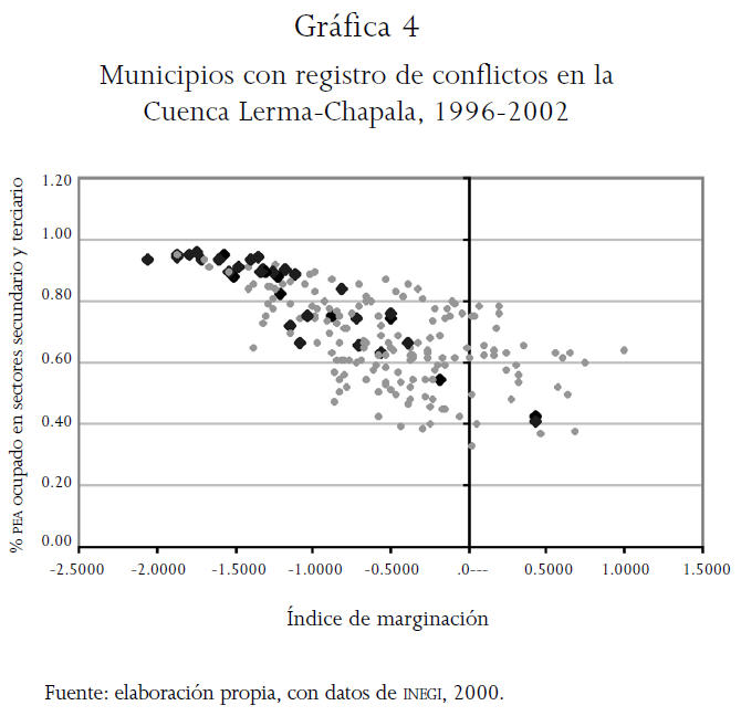 Las gráficas 4 y 5 muestran que el mayor número de movilizaciones sociales en los 204 municipios de la Cuenca Lerma-Chapala han sido en los de ingresos más altos, de mayor población, con menor índice de marginación y con mayores porcentajes de la PEA ocupada en los sectores industrial y de servicios.