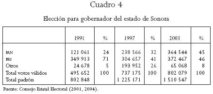 La transición democrática sonorense también se aprecia en la elección del gobernador. Después de una con gran margen de diferencia, entre el ganador y el opositor principal en 1991, cuando el candidato del PRI, Manlio Fabio Beltrones Rivera, obtuvo 71 por ciento de los votos; en 1997 se pasó a una en la que Armando López Nogales, del PRI, ganó con 41 por ciento de los votos. Todavía más reñida estuvo la de 2003, en que la diferencia porcentual fue de sólo un punto, y el triunfo fue para Eduardo Bours Castelo. Si bien en la gubernatura no se ha dado la alternancia, se aprecia un claro incremento en la competitividad electoral (véase cuadro 4).
