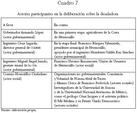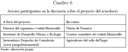 Los actores gubernamentales principales fueron el director del organismo de Hermosillo, el secretario de Desarrollo Urbano del gobierno del estado y sus asesores del despacho Inverméxico, convertido en actor paragubernamental, por ser contratado para asesorar al gobierno. Entre los principales actores sociales opuestos al proyecto, además de los mencionados, estaban los agricultores del valle del Yaqui, beneficiarios y derechohabientes de las aguas del río, pero que no fueron consultados ni participaron de manera pública, para influir en la decisión del proyecto (véase cuadro 6).