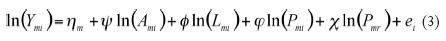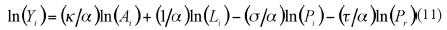 La función de producción obtenida es de corto plazo, cuyo único factor productivo es el trabajo L;8 y presenta rendimientos constantes a escala respecto a este factor si α=1; a escala creciente si 1 > α > 0 ya escala decreciente si α > 1. Expresa que un aumento en el volumen de la contaminación producida por la industria i y por otras dañará la producción de i. Por otro lado, es posible que las economías de aglomeración sobrepasen el efecto negativo e incrementen la producción. La ecuación (10) se encuentra en forma no lineal, por lo que al aplicar una transformación logarítmica se obtiene una versión lineal, que puede emplearse para establecer un modelo empírico:
