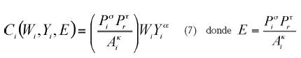 Y representa la producción de la industria i, E es la externalidad y Wi es el precio del factor trabajo utilizable en la producción en el corto plazo. Las restricciones en los parámetros son α > 0 y δ> 0.