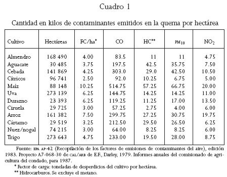 En el cuadro 2 se observa la cantidad de contaminantes emitidos por cada hectárea de residuos quemados. Esto se derivó de un estudio aplicado a los campos agrícolas de California (CARB 1993).También se muestra que las cantidades de CO son muy superiores a los demás contaminantes, ello indica que se deben tomar medidas para una quema adecuada o para reducir la superficie en que se realiza.