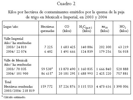 En Valle Imperial, en 2003 se quemó sólo 29 por ciento de los residuos de trigo, porque el agricultor recibió un estímulo económico del programa Crédito por Reducción de Emisiones (ERC, por sus siglas en inglés), además de que hubiera tenido que pagar si se excedía en la práctica. En este valle, la quema ha disminuido en 68 por ciento desde 1999, porque la siembra de espárrago se mandó a Mexicali (Poirez 2006), donde se incinera alrededor de 85 por ciento de los residuos de trigo (según una encuesta entre agricultores y técnicos en distintos puntos del valle). En el cuadro 1 se muestra un cálculo de la cantidad de contaminantes emitidos por las quemas de residuos de trigo en ambos valles en 2003 y 2004; cabe mencionar que sólo representan 1.8 y 2.5 por ciento del total de las pm10 para Imperial y Mexicali, respectivamente, de la contaminación del aire de esta cuenca binacional (Instituto Nacional de Ecología, INESecretaría de Medio Ambiente y Recursos Naturales y Pesca, SEMARNAP 1999, 96, 115).