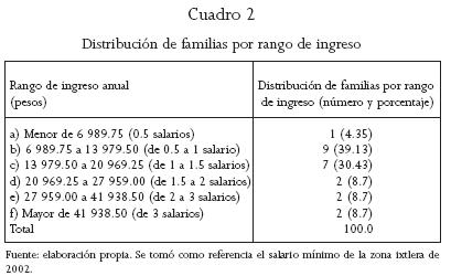 De acuerdo al cuadro 2, se puede observar que 74 por ciento de las familias (rango ac) se encuentra en pobreza absoluta y menos de 20 (rango ef) cuenta con ingresos medios. En cuanto a la participación de las actividades productivas en la estructura de los ingresos familiares, su fuente principal es la ganadería (69 por ciento), le siguen las actividades asalariadas (15); mientras que la agricultura representa (8), al igual que la explotación de las fibras duras naturales (ixtle), las cuales constituyen una fuente importante de ingresos en la región, incluso superior a la del comercio y la artesanía.