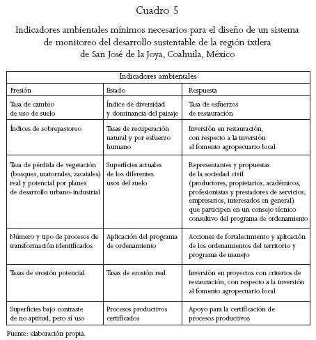Tras un estudio de indicadores de sustentabilidad en el ejido San José de la Joya, en la región rural ixtlera del semidesierto de Coahuila, se analizó información e indicadores construidos con base en la percepción, acción y participación de los pobladores locales, según un programa de ordenamiento ecológico comunitario participativo. Los resultados e indicadores corresponden a tres sistemas regionales: el ecológico (diversificación productiva); el productivo (rendimiento e independencia de insumos externos) y el socioeconómico (acceso a servicios, diversificación de empleo y calidad de vida). Se concluye que la generación de alternativas agropecuarias productivas, el ordenamiento ecológico del territorio, la planeación y administración del progreso local, así como las acciones que transiten hacia un modelo de desarrollo sustentable en la región ixtlera implican por fuerza reducir la vulnerabilidad y potenciar la diversificación de actividades económicas que generen empleo, ingreso y mejoren la calidad de vida para sus habitantes, y puedan articularse a los procesos de urbanización e industrialización del semidesierto del noreste de México.