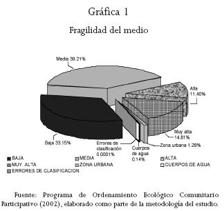 La expresión fragilidad ambiental se aplicó para denotar la oportunidad de recuperación de los espacios (territorios), ante cambios en sus componentes estructurales (suelo, vegetación, fauna, servicios ambientales) y a las alteraciones potenciales de uso de suelo, sobre todo en función de la inminencia de procesos de transformación. Por ejemplo, un área plana desmontada para fines agrícolas es menos frágil que una con pendiente alta para usos urbanos. En términos generales, 2 8 por ciento del territorio del ejido San José de la Joya es de fragilidad alta a muy alta, 39 por ciento es de media y 33 de baja. Las áreas más frágiles son los lugares con mayor pendiente y altitud, en donde los suelos son someros y los declives pronunciados. Entre los componentes locales de indicadores importantes también se encuentra la fragmentación de hábitat, como una expresión de la fragilidad del medio ambiente, pues es un indicativo del paisaje o de la función ecológica regional. En este sentido, las comunidades forestales presentes tienen menos representatividad y menor resistencia a agentes de cambio y, en muchos de los casos, son zonas boscosas con menores posibilidades de reversibilidad (véase gráfica 1).