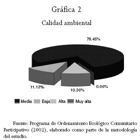 El término calidad ambiental se refiere a una conjunción de elementos tanto de presión (desmontes) como naturalidad o grado de intervención del hombre, y se considera como un balance de los efectos de la presión sobre el estado del territorio o recurso natural. La calidad ambiental del ejido de San José de la Joya no es muy alta dentro de su territorio, es más común la calidad media en 78.45 por ciento, esto significa que no tiene zonas con condiciones de vegetación, suelo y fauna muy conservadas. Los terrenos con calidad alta son los que tienen vegetación natural con fragilidad alta, concentrados en el extremo poniente del ejido. Los más transformados son los de calidad baja, como los embalses y centros de población, además de parcelas agrícolas erosionadas junto con la tierra sin vegetación aparente. Según esta consideración de procesos de cambio en la calidad ambiental, el territorio ejidal no está en equilibrio sino sometido a procesos de presión en poco menos de la mitad de la superficie, con alto porcentaje de terrenos en degradación o una tendencia marcada al deterioro. Es decir, que de persistir las prácticas de manejo de los recursos naturales en las condiciones prevalecientes, la calidad ambiental media se incrementará en los próximos años, con la consecuente pérdida de potencial productivo, y se hará más atractivo el proceso regional de urbanizaciónindustrialización con costos muy altos para la captación de agua y recarga de acuíferos (véase gráfica 2).
