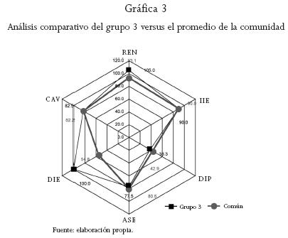 Formado por cinco familias, su característica es la poca cantidad de integrantes (tres o menos), esto favorece que el indicador die se ubique con facilidad en grados altos. En este grupo, el ren siempre se mantiene en 100 por ciento o más, pues en algunos casos el rendimiento obtenido es mayor al de la media regional, lo cual se atribuye a la ventaja que representa el tractor en la preparación de la tierra para la agricultura de temporal. Destaca que el DIP es bajo, lo que es explicable, en parte, por el número de integrantes de la familia, ya que al ser pocos es más difícil que se dediquen a otras actividades productivas, además de que centran sus esfuerzos en la agricultura y ganadería. Los índices DIP y ase de este grupo son menores al compararlos con los del promedio de la comunidad, esto explica la cantidad de integrantes. La comparación en la gráfica del grupo y el promedio de la comunidad muestra en la mayoría de los indicadores un valor mayor del propio grupo (véase gráfica 3), en el que se inscriben las estrategias de supervivencia ganadera y de empleo, descritas en la primera sección de los resultados.