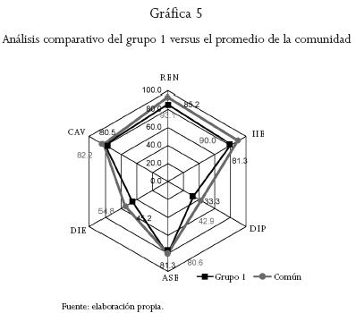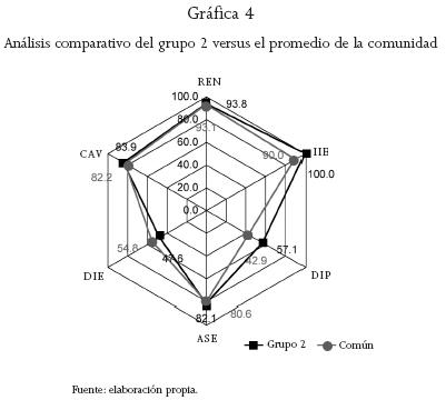 Las siete familias que conforman este grupo tienen cuatro o más integrantes; el valor del indicador DIP es más alto, ya que más personas pueden realizar actividades diversas. El die es menor que en el grupo 3, debido a que más miembros están integrados a la fuerza de trabajo, pero son pocos los empleos diferentes a la producción agropecuaria, en virtud de que la mayoría trabaja en la unidad familiar y en algunos casos los hijos no tienen edad para hacerlo fuera de la comunidad. Sobresalen los indicadores ren y IIE, con un valor alto, sobre todo en el caso de insumos externos en el que todas las familias tienen 100 por ciento, pues no dependen de ellos y sin embargo tienen buena producción. En el ase tiene el valor más alto, debido a que al ser más miembros aumenta la necesidad de servicios y quizá dediquen mayor tiempo y esfuerzo a obtenerlos que las familias del grupo 3 (véase gráfica 4). La comparación de las gráficas del grupo 2 con el promedio de la comunidad muestra una relación muy estrecha, ya que se trata del intermedio, destacan los valores de DIP e IIE pero con una diferencia menor, ambos mayores que el promedio, sólo en el caso del die es mucho menor en el grupo que en la comunidad.