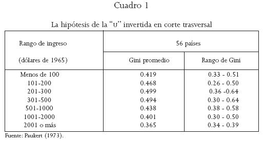 Uno de los primeros trabajos que utilizaron el análisis de corte trasversal fue el de Paukert (1973). Cincuenta y seis países se clasificaron en diferentes categorías de ingreso, de acuerdo con su producto nacional bruto (PNB) per capita de 1965, en dólares constantes. La desigualdad fue medida por el coeficiente de Gini; el cuadro 1 presenta algunos de sus hallazgos. También revela que parece existir una relación entre la desigualdad y el PNB del tipo predicho por Kuznets (1955) y Oshima (1962). Al menos, este es el caso una vez que los datos se agrupan de forma agregada por categoría o rango de ingreso. Esta relación sugiere que las amplias tendencias descritas antes se presentan, en promedio, entre países y a través del tiempo en el desarrollo de cada uno. De cualquier forma, la variación dentro de cada categoría particular está lejos de ser concluyente. La tercera columna del cuadro presenta las altas y bajas del coeficiente de Gini entre países en cada categoría. Un vistazo rápido a esta parte del cuadro dice que la noción de la hipótesis de la "U" invertida no es un proceso inevitable en la historia del desarrollo de cada país (Ray 1998).