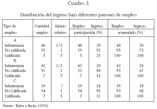 Hay otros trabajos que siguen respaldando la hipótesis de que el crecimiento económico genera desigualdad, por lo menos al principio del proceso. Taylor y Bacha (1976) arguyen que la estructura económica de los países cambia a medida que se desarrollan.3 Una cantidad importante de ellos, lo bastante grandes como para soportar un mercado interno integrado, parece experimentar esta transición; para explicarlo, los autores elaboraron un modelo matemático consistente, con las características siguientes: a) la estructura de la producción de los países grandes en desarrollo evoluciona de una forma regular, se alejan de la agricultura y las manufacturas de bajo valor agregado (alimentos y textiles), tienden hacia las intermedias de mayor valor (productos químicos y bienes de demanda final, como electrodomésticos y automóviles); b) durante el proceso de transición la distribución del ingreso empeora, ya que en la expansión de mercado la demanda de trabajadores calificados sube más rápido que su oferta, por lo que aumentan sus salarios, todo esto se ve reflejado en un "quiebre" en la curva de Lorenz, donde los pobres reciben una participación menor (y los ricos una mayor) del proceso de crecimiento económico. Los efectos señalados pueden observarse en el cuadro 3; los cambios en los patrones de empleo al pasar de la situación inicial A, a una B o C alteran la distribución del ingreso y c) hay un incremento en el papel desempeñado por el sector corporativo durante esta transición.