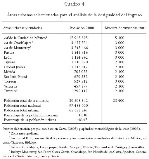 La medida o indicador central para el presente análisis de desigualdad es el coeficiente de Gini, para datos individuales (y no agrupados) de la PO de 12 de las áreas urbanas principales del país; pues la medición con datos agrupados introduce sesgos de subestimación atribuidos a la pérdida de información generada al no considerar la desigualdad dentro de cada grupo.8 Se hace hincapié en ello, porque es frecuente la comparación de coeficientes de Gini cuya metodología es distinta, y en los análisis comparativos se omite hacer referencia a los procedimientos operativos que están detrás, y se actúa como si todas las estimaciones estuvieran generadas con la misma calidad estadística. El cálculo para datos no agrupados es posible gracias a la evolución de paquetes estadísticos más sofisticados y potentes. El utilizado para calcular los coeficientes de Gini es el Stata SE versión 8, a partir de los micro datos del ingreso salarial9 de la ENEU. Debido a que la desigualdad se mide por el coeficiente de Gini, el cual cumple con el principio de ingreso relativo (Medina 2001), no es necesario que el año base de los salarios sea igual al de las variables independientes.