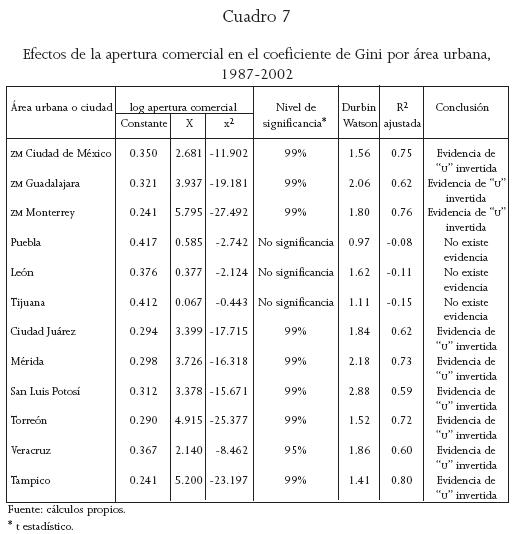 En este punto del análisis resulta pertinente preguntarse, ¿cómo le ha perjudicado a cada ciudad el proceso de liberalización económica?, ¿se sigue presentando el proceso de Kuznets dentro de cada una? El análisis comparativo de las tendencias de los coeficientes de Gini en las distintas ciudades en el marco de un proceso de liberalización económica ofrece un excelente laboratorio, para explorar los efectos diferenciados de dicha política en ciudades bajo un entorno económico, político y social nacional, pero con características sui géneris para enfrentar dicho proceso de liberalización. Se utiliza el indicador de apertura comercial nacional como variable explicativa, ya que presentó mejor ajuste en los ejercicios anteriores. Los resultados por ciudad se resumen en el cuadro 7.