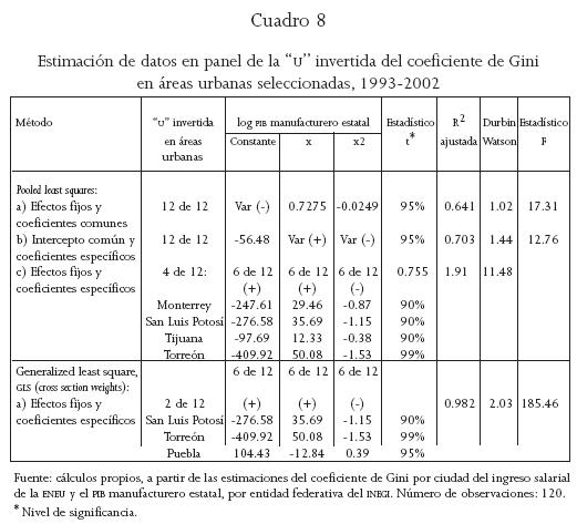 Al aplicar la técnica de datos en panel con mínimos cuadrados generalizados y utilizar como variable explicativa de la desigualdad al PIB manufacturero estatal, se encontró que sólo existe evidencia de la "U" invertida en dos de las 12 ciudades o áreas urbanas de análisis: San Luis Potosí y Torreón, cuyo ingreso salarial no resulta ser de los más favorables con respecto al proceso de liberalización económica (véase cuadro A4). En muchas áreas urbanas la desigualdad comenzó a disminuir o continúa haciéndolo, en parte por la desaceleración estadounidense de 2001, lo que perjudica a los sectores y regiones exportadores en cuanto a que reduce sus ganancias relativas con respecto al resto de la economía mexicana (Plascencia 2007).