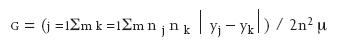 La doble sumatoria indica que primero se deben sumar todas las j, y mantener constantes las k, para después sumarlas todas. Esto es como sumar todas las diferencias de pares de ingresos (ponderados por los números de dichos pares, nj nk). Debido a que cada par es contado doble, primero yj — yk y después yk – yj, toda la expresión se divide entre dos, así como los normalizadores de la población y el ingreso (Ray 1998).
