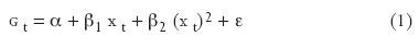 10 Se utiliza una variable cuadrática para permitir un cambio de dirección y captar la posible presencia de una "U" invertida, que no sería detectable si la regresión fuese lineal. Así, si β1 > 0 y β2 < 0, se tendrá una "U" invertida. Por otra parte, si β1 < 0 y β2 > 0, la gráfica obtenida será una "U". Debe advertirse que la ecuación 1 no es la única regresión funcional que puede utilizarse para encontrar la "U" invertida, se tiene la siguiente especificación alternativa: G t = α+β xt + β2 (1 / xt) + ε (Gujarati 2004; Wooldridge 2001).