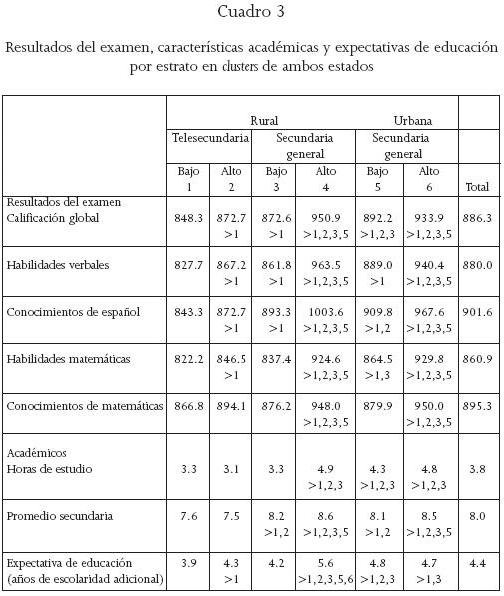 Los alumnos de Nuevo León obtuvieron calificaciones globales superiores a los de Chiapas en los estratos bajos, mientras que en los altos no hubo diferencias relevantes en ningún tipo de secundaria. Las discrepancias se mantienen en los estratos bajos de telesecundaria y secundarias rurales, al considerar sólo la calificación de las habilidades verbales. En cambio, en las de matemáticas no parece haber distingos entre los estados, salvo en el bajo de las secundarias rurales, donde Nuevo León superó a Chiapas.