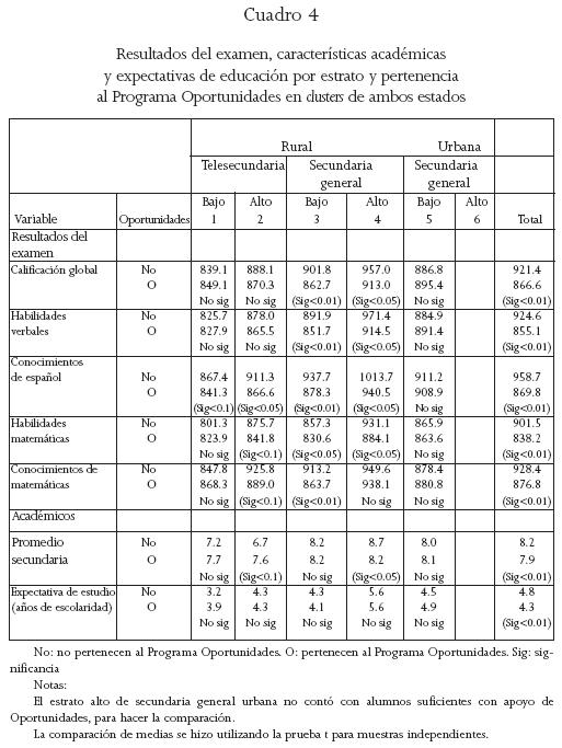 No es sorprendente encontrar estas divergencias entre el desempeño académico y el tipo de escuela. Otros investigadores, como Reimers (2000), han obtenido resultados similares. Lo interesante es que aun cuando se presenta el examen en contextos diferentes, la estructura de calificaciones permanece fuertemente asociada al tipo de secundaria de donde provienen los alumnos. Por ello, la comparación del resultado en el examen de los becarios de Oportunidades sólo se hará con respecto a quienes van al mismo tipo de escuela.